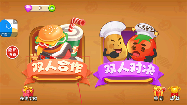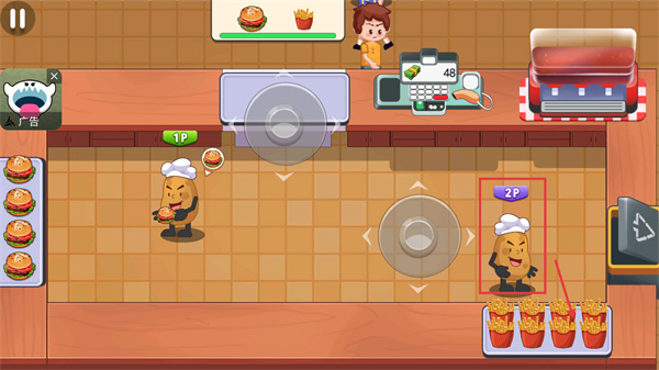 1、選擇【雙人合作】模式,與伙伴協(xié)作經(jīng)營快餐店,共同完成訂單任務(wù),提升游戲收益。