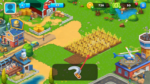 2、待作物成熟后,將【鐮刀】拖動至農(nóng)田,收割成熟的【小麥】,可用于直接交易或工廠加工。