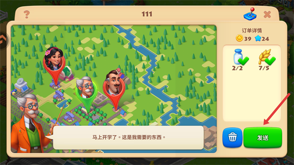4、在訂單界面湊齊【牛奶】、【小麥】等所需物資,點擊【發(fā)送】按鈕,獲取金幣和經(jīng)驗。