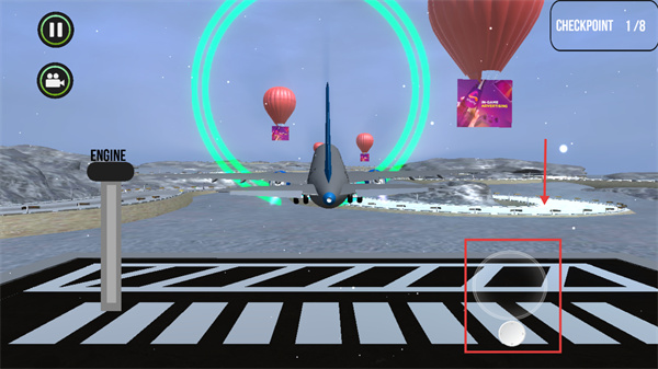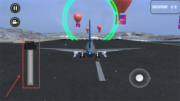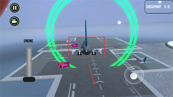2、進入關(guān)卡后,先操作【ENGINE】控件啟動飛機動力,優(yōu)先向綠色環(huán)型區(qū)域移動。