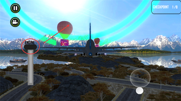 2、操控右側(cè)方向鍵向下移調(diào)整飛機(jī)方向,向綠色環(huán)型區(qū)域移動(dòng),同時(shí)通過(guò)左側(cè)【ENGINE】控件維持動(dòng)力。