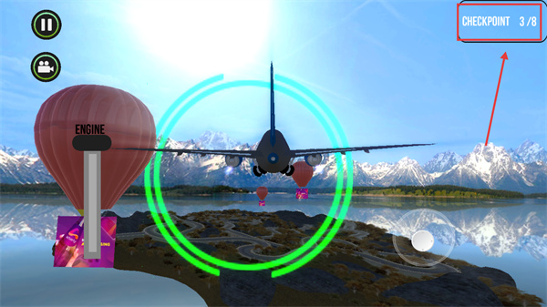 4、推進(jìn)至【CHECKPOINT-3/8】時(shí),圍繞綠色環(huán)型區(qū)域調(diào)整飛機(jī)位置,確保處于區(qū)域內(nèi)以持續(xù)更新checkpoint進(jìn)度。