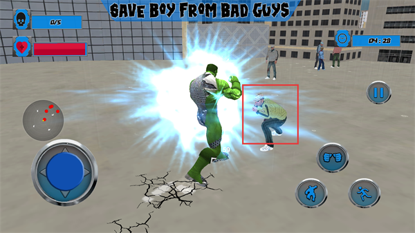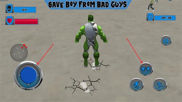 2、用左側方向鍵控制英雄移動,右側拳頭按鈕觸發(fā)攻擊,根據(jù)小地圖提示定位敵人位置。