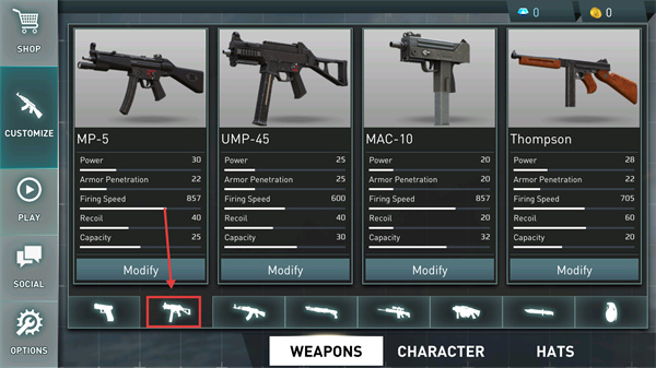4、在【W(wǎng)EAPONS】界面選擇【MP-5】等槍械,點擊【Modify】可調整武器配置,適配不同戰(zhàn)斗需求。