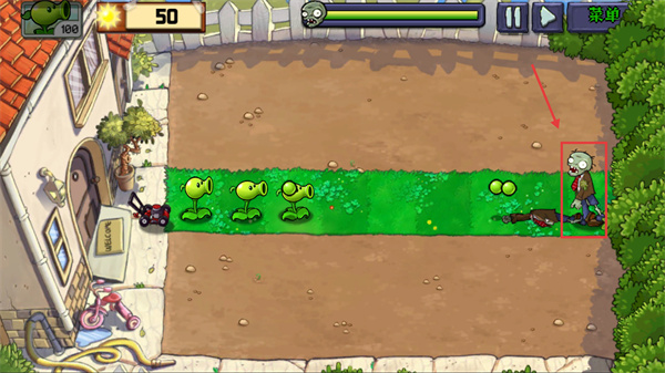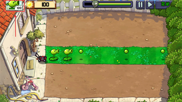 2、戰(zhàn)斗前消耗【100】陽光種植【豌豆射手】,在草坪區(qū)域部署植物,構(gòu)建基礎(chǔ)防御陣線以抵御敵人進攻。