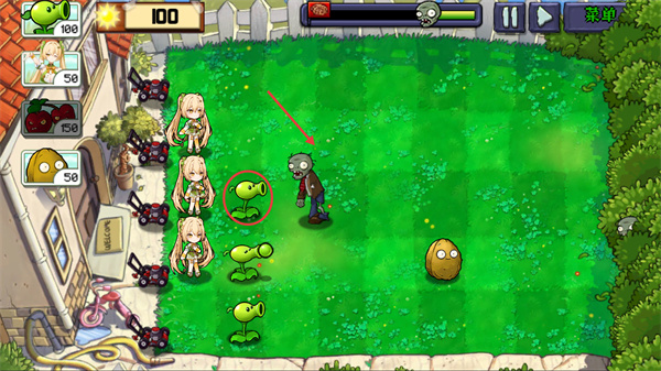 3、當(dāng)陽(yáng)光儲(chǔ)備達(dá)【100】時(shí),補(bǔ)充【豌豆射手】強(qiáng)化火力,配合已部署的【土豆地雷】構(gòu)建“輸出+攔截”的防線體系。
