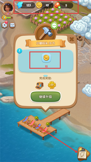 1、升級(jí)【小鎮(zhèn)碼頭(3/7)】需消耗15金幣,完成后可獲得物資和經(jīng)驗(yàn)獎(jiǎng)勵(lì),點(diǎn)擊“繼續(xù)升級(jí)”推進(jìn)建筑發(fā)展。