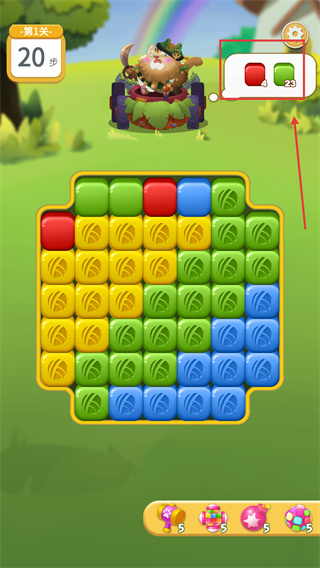 1、進(jìn)入【第1關(guān)】后,需在【20步】內(nèi)完成目標(biāo),留意界面顯示的【紅-4】【綠-23】目標(biāo)進(jìn)度。