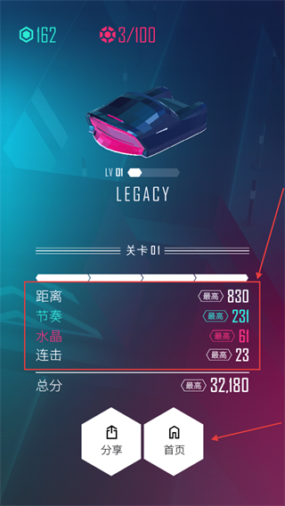 3、關(guān)卡結(jié)束后查看【距離】-【節(jié)奏】-【水晶】-【連擊】數(shù)據(jù),了解表現(xiàn)并對(duì)比最高記錄找提升點(diǎn)。