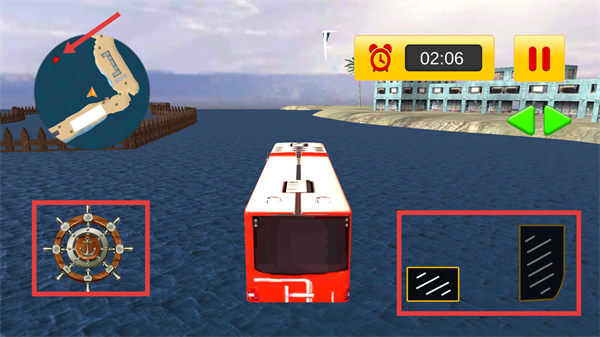 2、利用左下角紅色框內(nèi)的方向盤控制巴士方向,右上角紅色框內(nèi)的按鈕控制巴士的加速和減速,同時參考左上角紅色箭頭指向的地圖,規(guī)劃行駛路線。