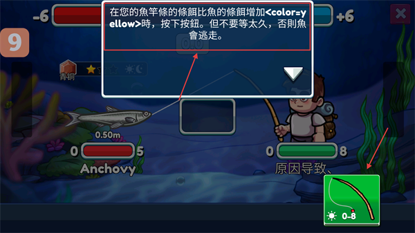 2、觀察頂部魚的對抗度計量條,掌控力量條擺動節(jié)奏,差距越大拉力越強需及時調整。