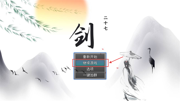 1、進入游戲主界面,點擊【繼續(xù)游戲】按鈕,開啟你的古風(fēng)江湖冒險之旅,體驗像素畫風(fēng)下的武俠世界。