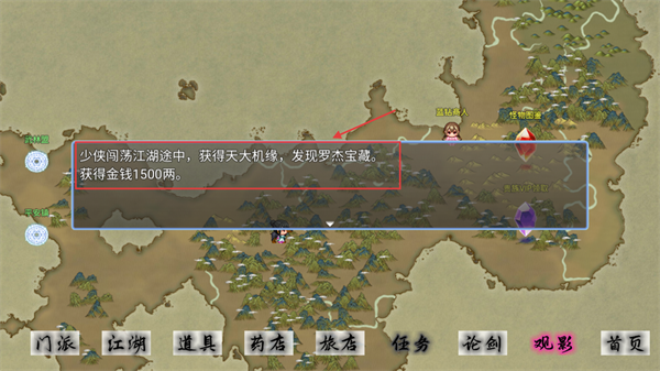 2、在江湖地圖中探索,觸發(fā)機緣發(fā)現(xiàn)【羅杰寶藏】,可獲得【金錢1500兩】,為后續(xù)冒險積累資源。