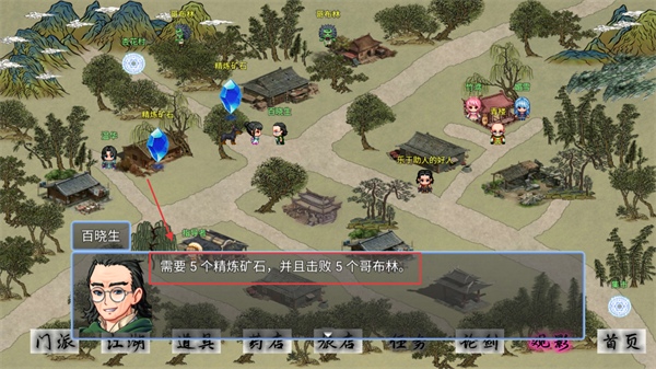 3、與【百曉生】對話接取任務(wù),需收集【精煉礦石-5個】并擊敗【哥布林-5個】,推進江湖歷練進度。