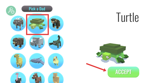 2、在【Pick-a-Dad】界面選擇烏龜作為父親動(dòng)物,點(diǎn)擊【ACCEPT】確認(rèn)選擇呀。