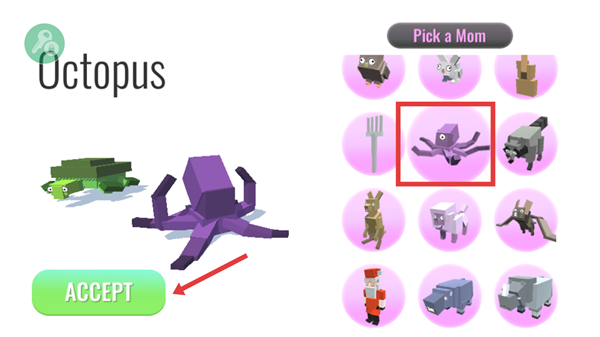 3、接著在【Pick-a-Mom】界面選擇章魚作為母親動(dòng)物,點(diǎn)擊【ACCEPT】完成雙親選擇啦。