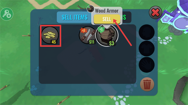 1、打開背包界面,選中閑置物品如【W(wǎng)ood-Armor】后點擊【SELL】按鈕,就能賣掉物品獲取硬幣啦。