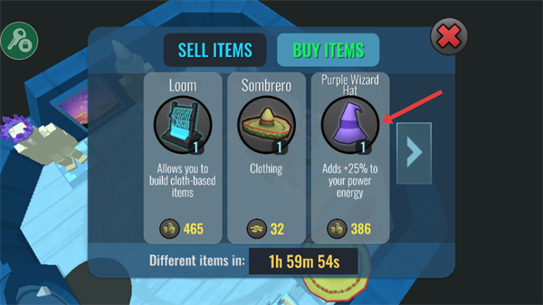 4、在購買界面中,選擇【Purple-Wizard-Hat】購買,助力戰(zhàn)斗與探索,還可留意物品刷新時間,及時入手新道具呀。