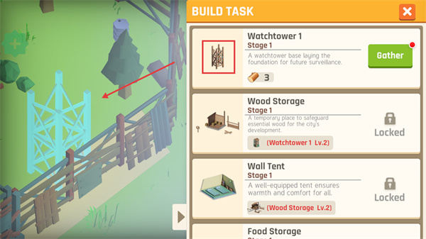 1、在【BUILD-TASK】界面選擇【W(wǎng)atchtower-1-Stage-1】,可建造瞭望塔建造,為基地提供偵察功能。