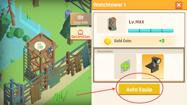 1、面對(duì)【W(wǎng)atchtower-1】的【Lv.MAX】狀態(tài),點(diǎn)擊【Auto-Equip】可快速配置裝飾,節(jié)省操作步驟。
