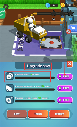 4、在升級界面選擇【Upgradesaw】,可添加鋸片等提升割草效率,助力資源收集和金幣獲取。