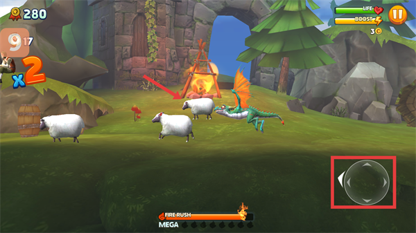 1、用右下角搖桿控制龍移動,優(yōu)先捕食羊群,快速積累分數(shù),這樣開局就能打好基礎(chǔ)啦。
