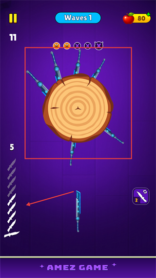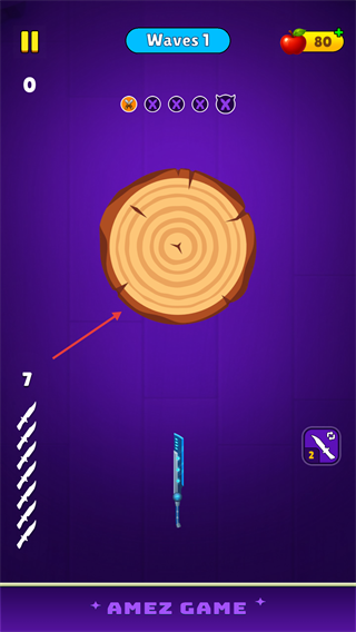 2、在【W(wǎng)aves-1】關(guān)卡中,操控刀具切割木材,左側(cè)顯示剩余刀具數(shù)量,完成切割可積累進(jìn)度推進(jìn)關(guān)卡。