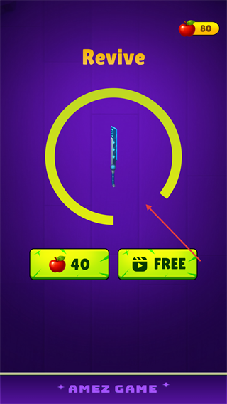 4、若失敗觸發(fā)【Revive】界面,可選擇消耗【40】蘋果或觀看視頻復(fù)活,快速回到關(guān)卡繼續(xù)操作。
