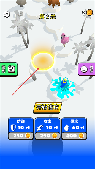 1、在【第2關(guān)】界面,消耗金幣升級(jí)【防御-10】【攻擊-10】【墨水-60】屬性,點(diǎn)擊【開始進(jìn)攻】進(jìn)入關(guān)卡,提升隊(duì)伍戰(zhàn)力。