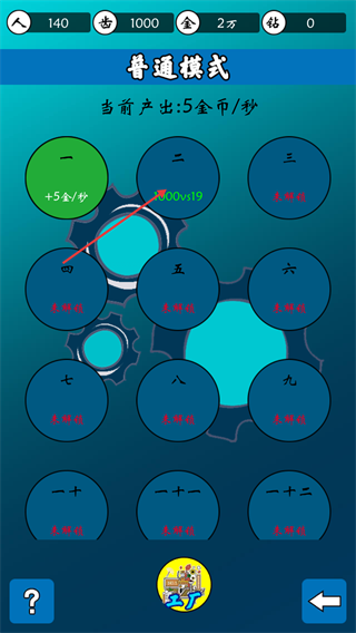 2、【普通模式】中,先解鎖“一”關卡獲取【+5金/秒】的基礎產(chǎn)出,后續(xù)可通過提升關卡等級增加金幣產(chǎn)出效率。