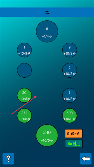 3、在關卡“二”中,點擊帶數(shù)值的圓形按鈕積累資源,可開啟【自動】功能自動收集,或用【加速1】提升獲取速度。