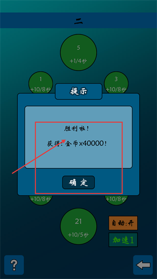 4、完成關卡后獲得【金幣×40000】獎勵,點擊【確定】領取資源,可用于解鎖更多關卡或提升產(chǎn)出效率。