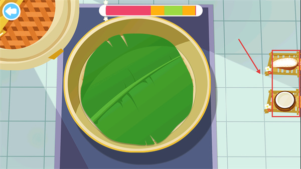 1、先選取【配料架】上的糖與椰子類食材,添加到鋪有蕉葉的容器中,推進烹飪準(zhǔn)備流程。