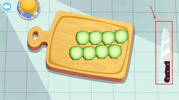 3、使用【菜刀工具】對砧板上的食材進行切割處理,將其分成指定數(shù)量的塊狀,完成預(yù)處理。