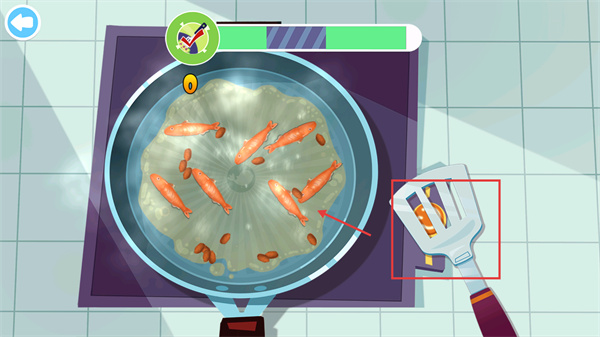 4、操作【鍋鏟工具】翻動鍋內(nèi)的小魚與配料,確保食材受熱均勻,提升烹飪完成度。