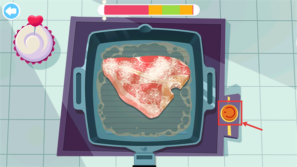 3、將處理好的【牛排】放入煎鍋,點(diǎn)擊加熱按鈕調(diào)控火候,完成牛排的煎制步驟,推進(jìn)菜品制作流程。