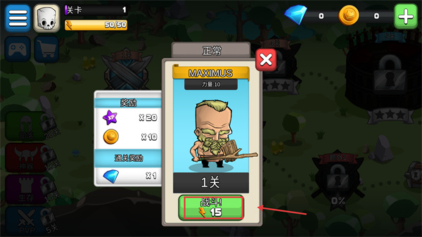 1、選擇角色后,點(diǎn)擊【戰(zhàn)斗】按鈕進(jìn)入1關(guān),可獲取【獎(jiǎng)券-20】【金幣-10】等獎(jiǎng)勵(lì)。