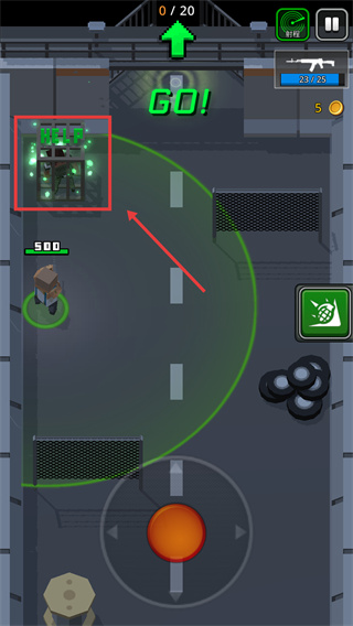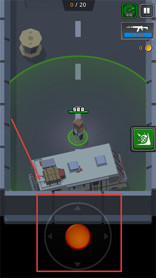 2、操控底部的虛擬搖桿移動(dòng)角色,利用【500】標(biāo)識(shí)的攻擊范圍,靠近物資區(qū)域可準(zhǔn)備戰(zhàn)斗。