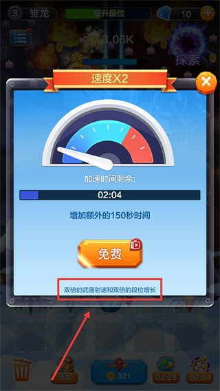 4、開啟【速度X2】功能可獲得【雙倍的武器射速和雙倍的段位增長】,點擊【免費】按鈕延長加速時間,高效推進進度。
