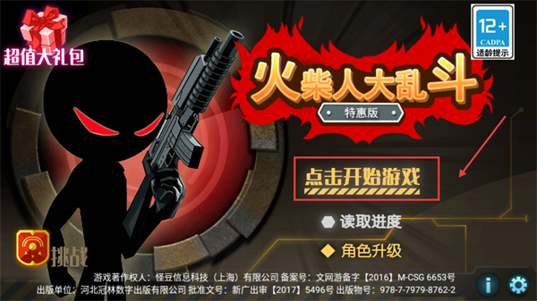 1、進(jìn)入【火柴人大亂斗】后,點(diǎn)擊【點(diǎn)擊開(kāi)始游戲】進(jìn)入。