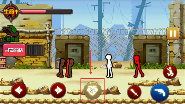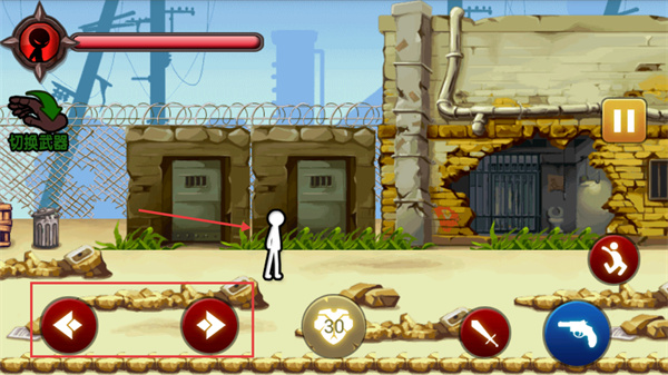 2、戰(zhàn)斗界面中,通過(guò)左右方向鍵控制移動(dòng),遇到敵人時(shí)可點(diǎn)擊【切換武器】按鈕提升初期戰(zhàn)斗效率。