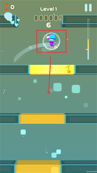 2、在【Level1】中,控制泡泡包裹的角色下落至帶【音符】的平臺(tái),可積累分?jǐn)?shù),同時(shí)注意躲避平臺(tái)間隙避免掉落。