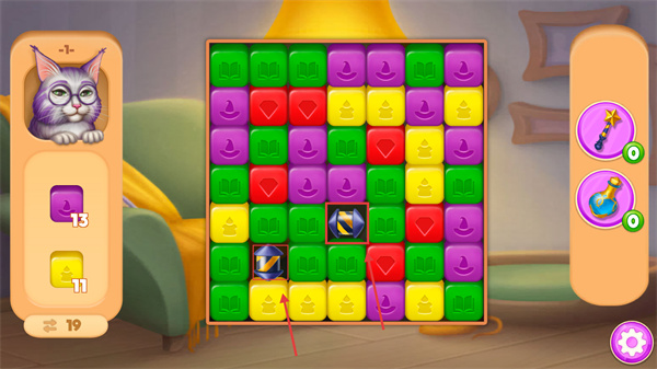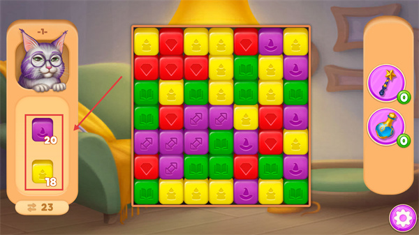 2、消除對應(yīng)圖案積累數(shù)量,優(yōu)先湊齊【紫色巫師帽-20】與【黃色蠟燭-18】的目標(biāo),推進(jìn)關(guān)卡進(jìn)度。
