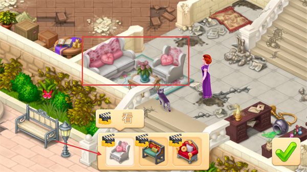 4、解鎖裝飾界面后,選擇對應(yīng)家具樣式,通過看廣告獲取道具來裝飾場景,解鎖新的游戲內(nèi)容。