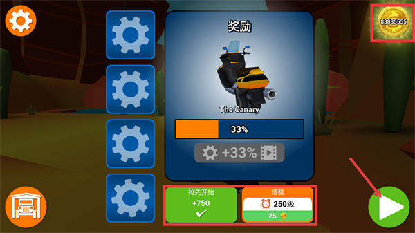 1、在游戲界面,可查看【The-Canary】摩托的解鎖進(jìn)度,選擇【增強(qiáng)-250級(jí)】提升進(jìn)度后,點(diǎn)擊綠色開(kāi)始按鈕進(jìn)入游戲。
