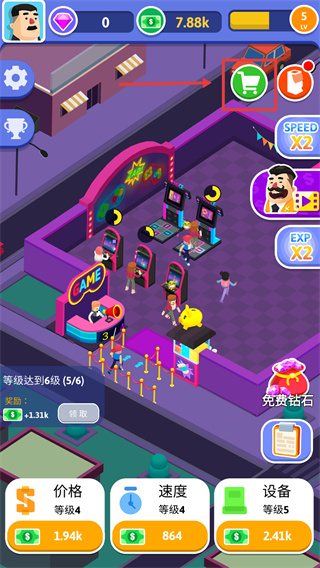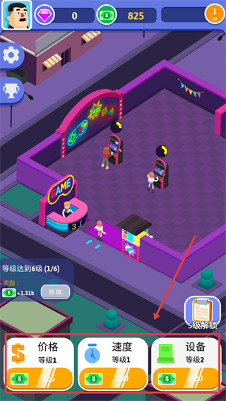 1、消耗對(duì)應(yīng)金幣升級(jí)【價(jià)格-等級(jí)1】【速度-等級(jí)1】【設(shè)備-等級(jí)2】,提升游戲城的收益效率與運(yùn)營能力。