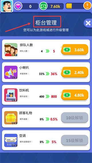 4、在【柜臺(tái)管理】界面升級(jí)【排隊(duì)人數(shù)】等項(xiàng)目,提升來客頻率與額外收益,強(qiáng)化游戲城的運(yùn)營效果。