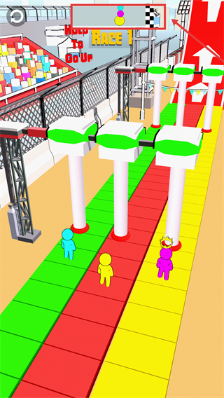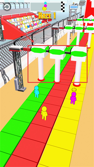 2、在賽道中需操控角色躲避【升降障礙】,選擇對應(yīng)顏色的跑道前進,避免被障礙阻擋進度。