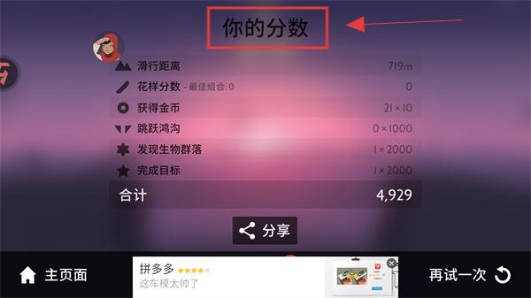 4、結(jié)算界面中【滑行距離-719m】等數(shù)據(jù)是任務(wù)目標(biāo),完成對應(yīng)項可解鎖新角色與場景。