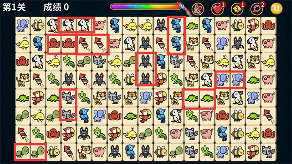 2、處于【第1關(guān)】時(shí),觀察界面中相同的動(dòng)物圖案(如框選樣式),點(diǎn)擊匹配消除,初始【成績(jī)-0】會(huì)隨消除操作逐步提升。